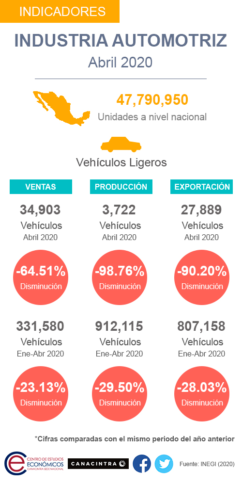 Meksika Ulusal Otomobil Parçaları Endüstrisi (INA) 2020 yılında otomotiv yedek parça ve bileşenleri üretiminde %40 düşüş beklediklerini ve üretimin 57,61 milyar dolar seviyesinde gerçekleşeceğini açıklamıştır. INA, Kuzey Amerika genelinde hafif araç üretiminin 16,78 milyondan 12 milyon birime düşmesinin beklendiğini ve bu düşüşün Meksika otomotiv yedek parça sektörüne 10 yıllık bir kayıp olarak etki edeceğini tahmin etmektedir. Meksika Otomotiv Satıcıları Birliği (AMDA) ise bu yıl otomotiv parçaları üretiminde %35 (önceki tahmin %25,5 idi) ve araç satışlarında %28 düşüş beklediklerini açıklamıştır.
