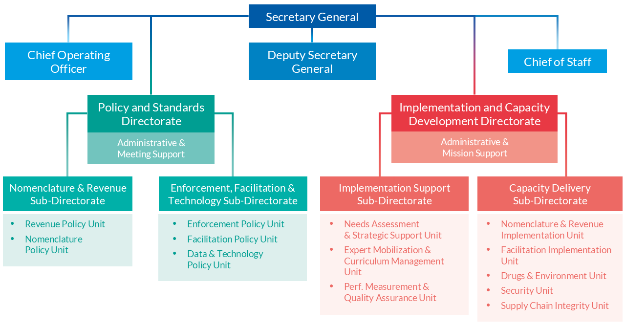 DGÖ Sekretaryası, Örgütün merkezi olan Brüksel/Belçika’da bulunmaktadır. Sekretaryada bir Genel Sekreter, bir Genel Sekreter Yardımcısı ile üç Direktörlük yer almaktadır. DGÖ Sekretaryasında görev yapan Genel Sekreter, Genel Sekreter Yardımcısı ve 3 Direktör Konsey tarafından 5 yıllık süreyle seçilmektedir. Direktörlükler Mevzuatın Uygulanması ve Kolaylaştırma, Tarife ve Ticaret ile Kapasite Geliştirme Direktörlükleridir.