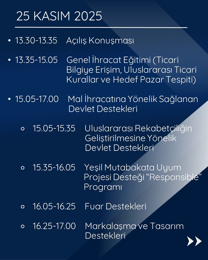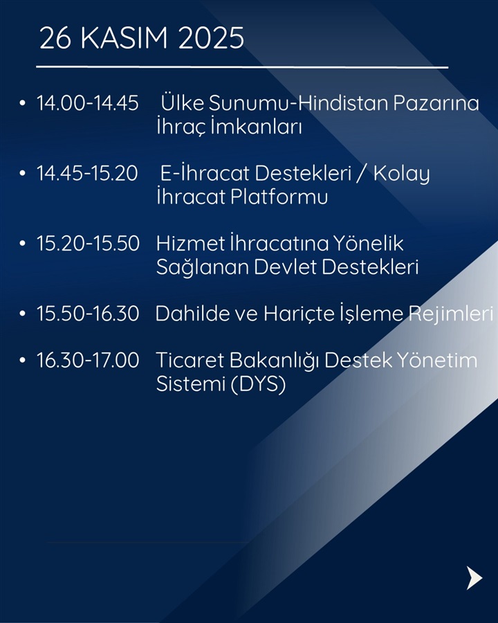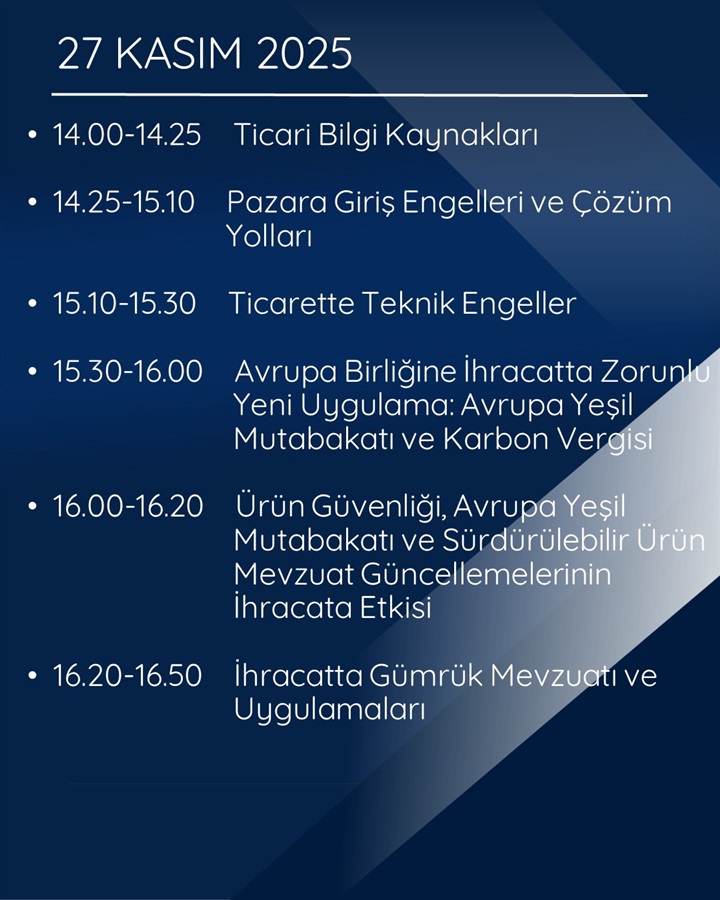 07 Kasım 2025Bakanlığımızca 25-26-27 Kasım 2025 tarihlerinde “Ticaret Bakanlığı İhracat Süreçleri ve Devlet Destekleri Eğitim Programı” görselde verilen program akışı çerçevesinde çevrimiçi olarak düzenlenecektir.