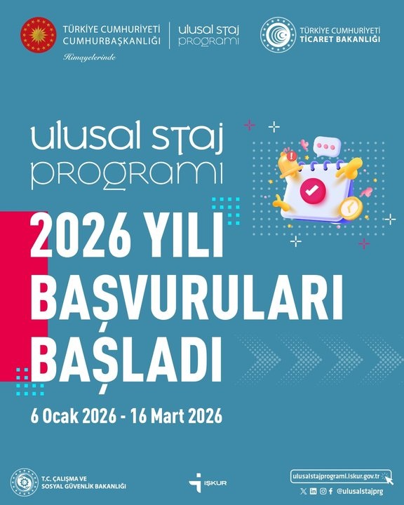 Gençlerimizin fırsat eşitliği ve liyakat esasları çerçevesinde kamu ve özel sektörde sunulan erken dönem kariyer imkânlarından faydalanmasını amaçlayan Ulusal Staj Programı, 2026 yılı itibarıyla Cumhurbaşkanlığı Himayelerinde Türkiye İş Kurumu (İŞKUR) tarafından yürütülecektir.