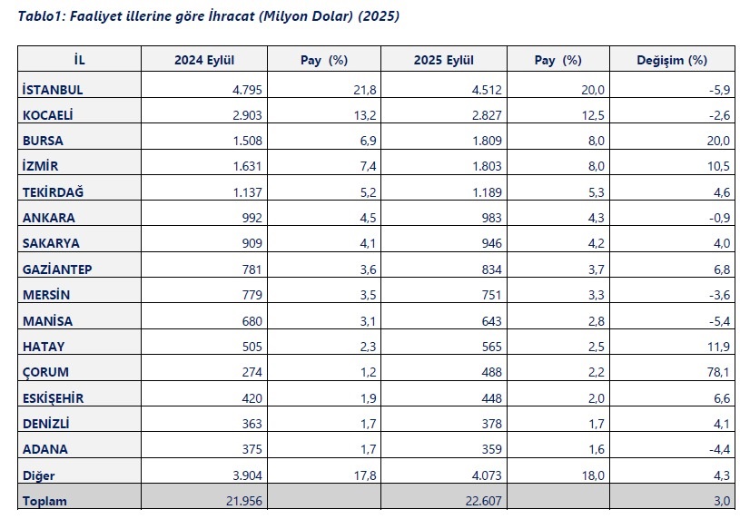 2025 Yılı Eylül Ayında Faaliyet İlleri Bazında İhracatta; |