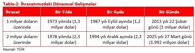1973 yılında, bir yılda 1 milyar dolar ihracat yapılabilirken, 1987’de bu başarı bir ayda, 2013’ten itibaren ise bir günde gerçekleştirilebilir hale gelmiştir. Bugün ise günlük ihracatımız zaman zaman 2 milyar dolara ulaşmaktadır.