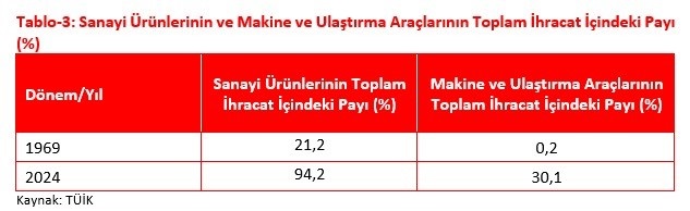 1969 yılında sanayi ürünleri ihracatının toplam ihracat içindeki payı %21,2 iken, 2024 yılı itibarıyla bu oran %94,2’ye yükselmiştir. Aynı şekilde, 1969 yılında makine ve ulaştırma araçlarının toplam ihracat içindeki payı yalnızca %0,2 düzeyindeyken, 2024 yılında bu oran %30,1’e ulaşmıştır.