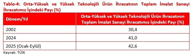 Bu gayretlerimizin bir sonucu olarak, 2002 yılında %30,4 olan orta-yüksek ve yüksek teknolojili ürün ihracatının toplam imalat sanayi ihracatımız içindeki payı, 2024 yılında %41’e, 2025 yılının ilk 9 ayında ise %42,6’ya yükselmiştir. Son 22 yılda sağlanan bu büyük başarıyla orta yüksek ve yüksek teknolojili ürün ihracatımızda artış aralıksız devam etmektedir.