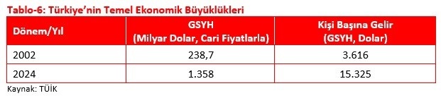 2002-2024 döneminde Gayri Safi Yurt İçi Hasıla reel olarak yüzde 216 oranında artmış, dolar bazında yaklaşık beş kat büyümüştür. 2002 yılında 238,7 milyar dolar olan milli gelir 2024 yılında 1 trilyon 358 milyar dolara, kişi başına gelir ise 3.616 dolardan 15.325 dolara yükselmiştir.
